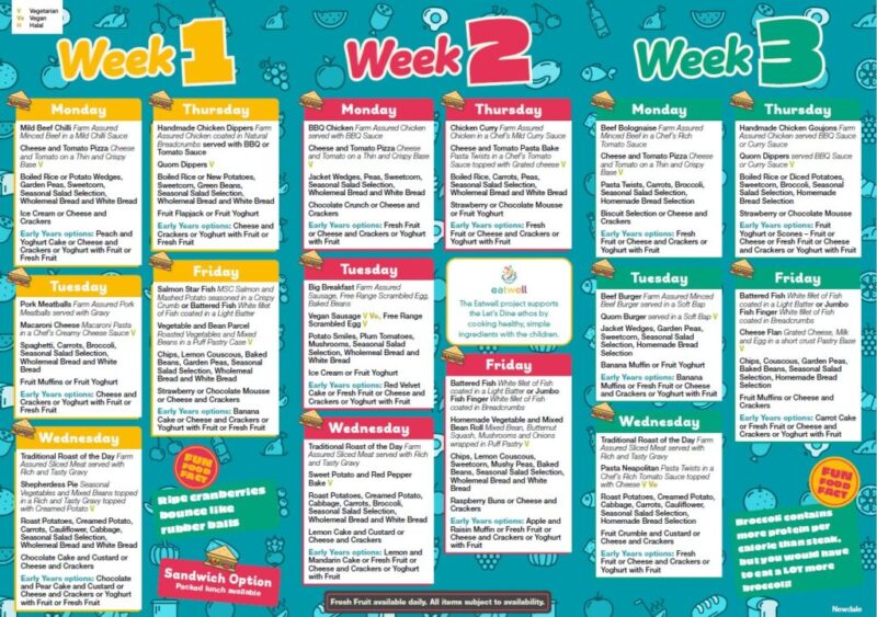 You will be given the school menu which shows the meals that are being prepared on a three week rotation. The menus always reflect the seasons with different vegetables and fruit on offer. All our schools aim to cater for those on special diets because of medical, cultural or religious reasons.