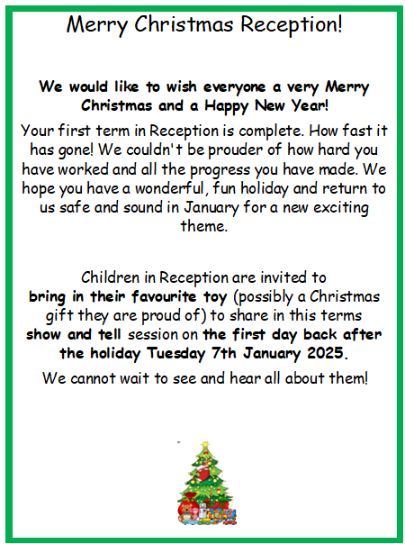 A reminder that tomorrow (Tuesday), children in Reception are invited to bring in 1 toy, clearly named (please no electronics or toys with small parts that could get easily lost) for a show and tell session in the afternoon.