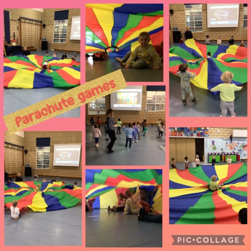 Indoor PE we played lots of different parachute games relating to our Theme topic of ‘ what goes up, must come down ‘