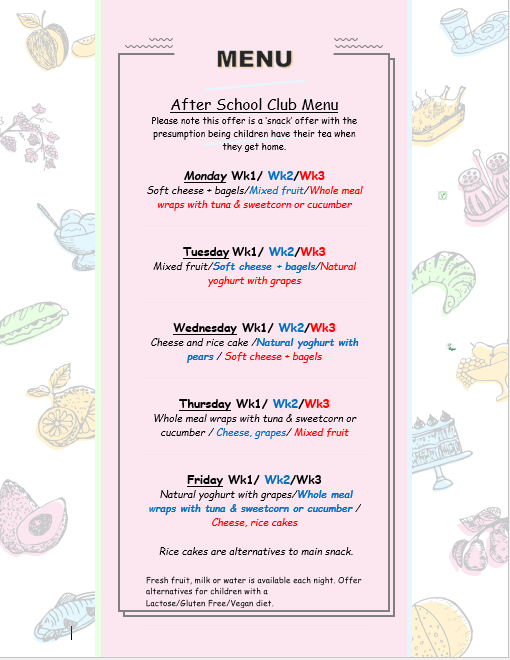Please note that afterschool club provides a ‘snack’ offer with the presumption being children have their tea when they get home.