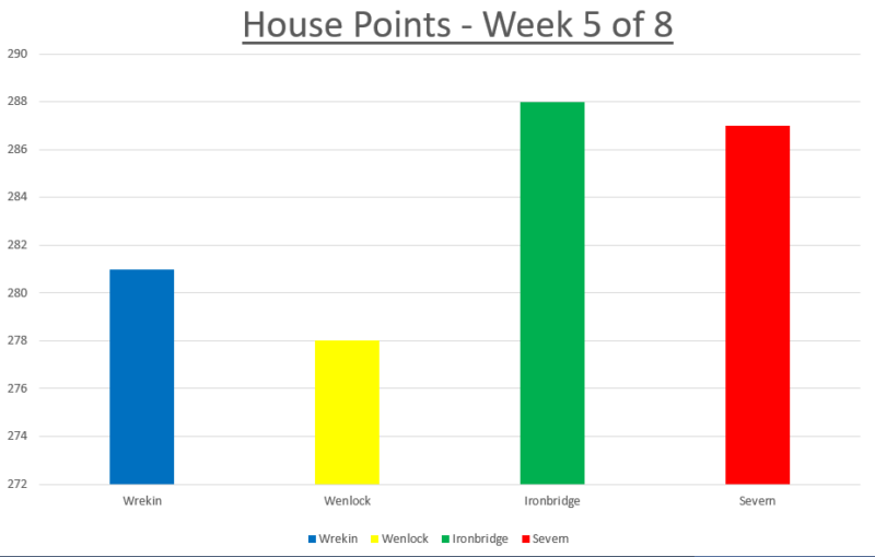 At Newdale, one of the ways our pupils are rewarded for their efforts, in work and behaviour, is house points. Each pupil belongs to 1 of 4 houses; Wenlock, Wrekin, Severn and Ironbridge. This year, the house team with the highest number of house points at the end of each half-term, will earn a special house celebration (full of lots of fun games and activities). Each week, we share the running totals in assembly but as we are now half way through the half-term, we thought we would share them with our wider community too. 3 more weeks to go and there’s only 10 house points between first and fourth… it is still all to play for!