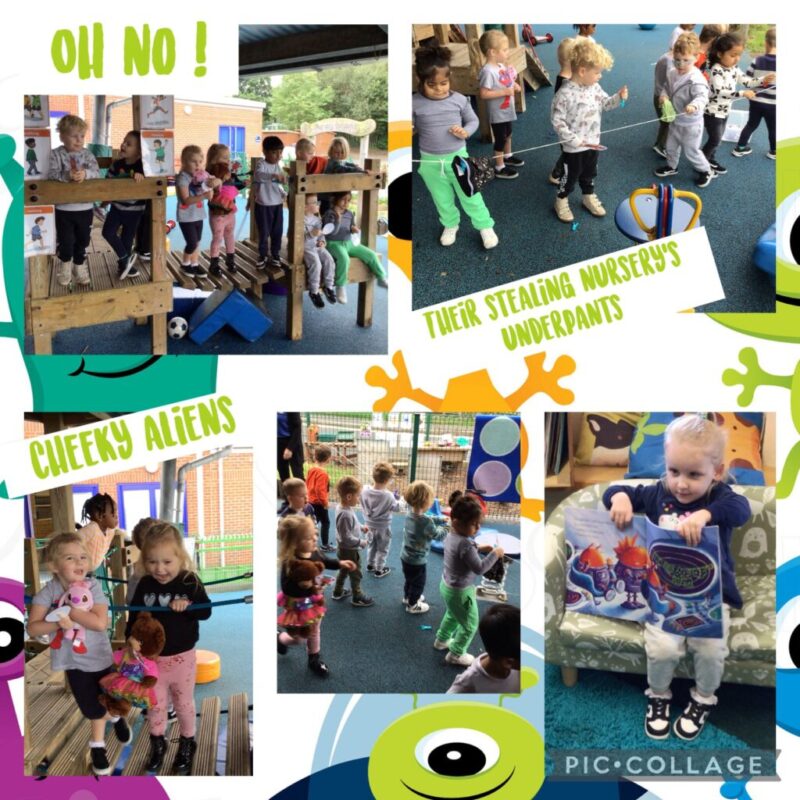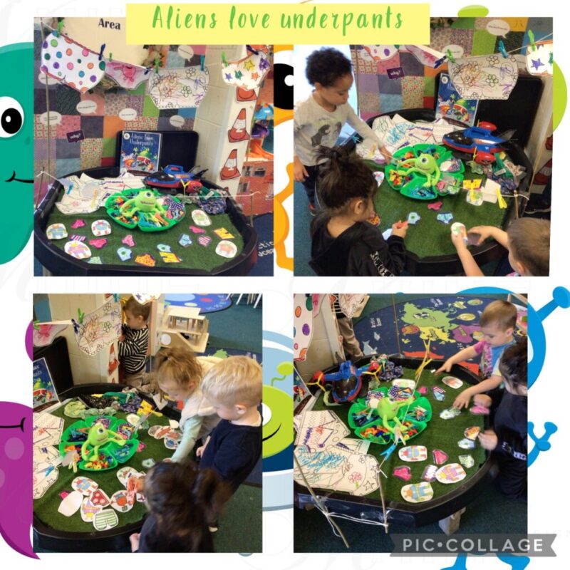 Digesting the book into parts we extended their learning, they made a rocket in their team groups ready for the launch competition on Friday, role played Aliens stealing nursery’s underpants from our washing lines. Guessing which character has gone missing, pairing and matching underpants, and washing underpants, (all clean ones though) and seeing how long it took them to dry in the breeze. Thankfully the weather was on our side.