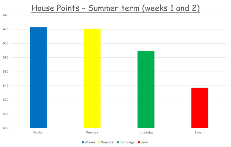 Lots of house points have been gathered over the last two weeks. Wrekin are in the lead for Summer 1 with 623 points. They are closely followed by Wenlock with 621. Ironbridge are in third with 589 and Severn in 4th with 537. Well done, everyone!